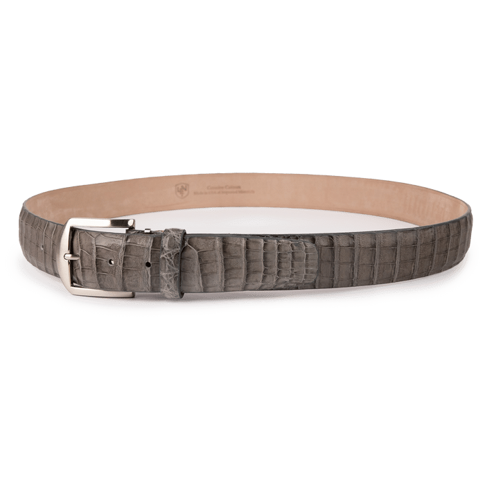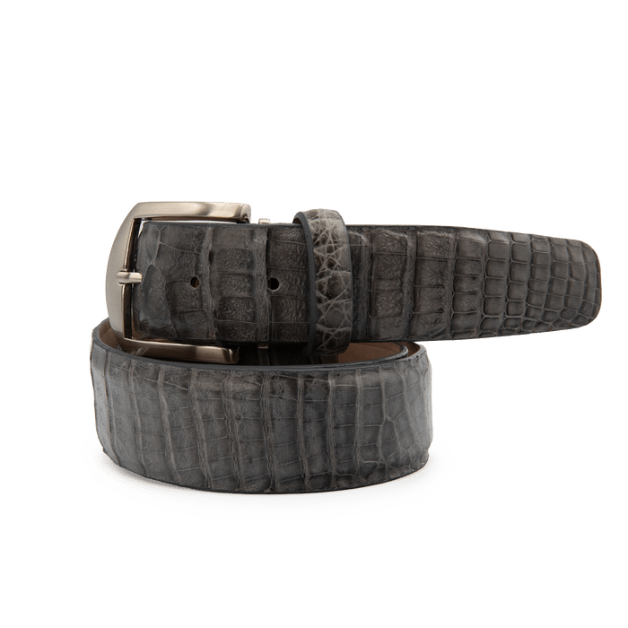 Little needs to be said with leather as beautiful as this 40-millimeter Caiman Crocodile. With the texture and unique pattern being the focal point, we chose not to stitch these classic belts. Styled in dark gray with matching edge.