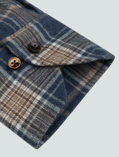 This checked flannel shirt is made of twofold cotton. The shirt is detailed with mother of pearl buttons, single cuffs and a button down collar.
