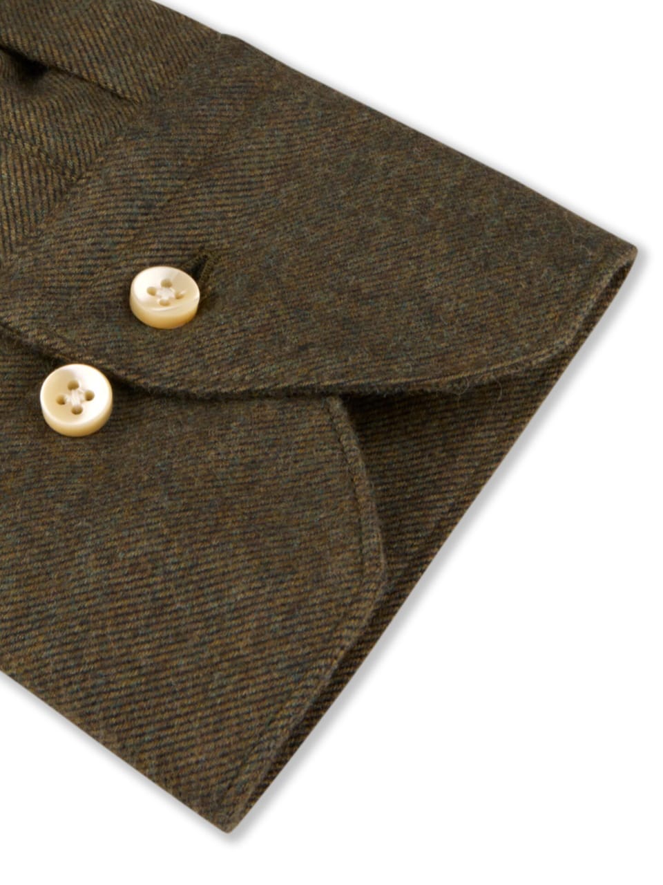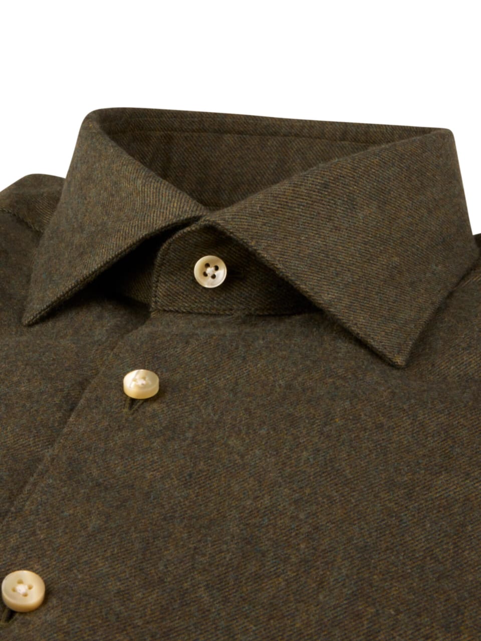 This flannel shirt is made of twofold cotton and is detailed with mother of pearl buttons, single cuffs and a cut away collar.