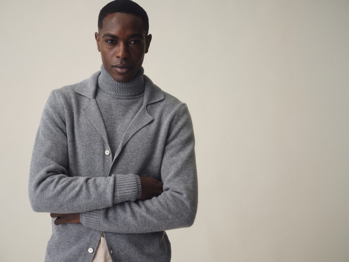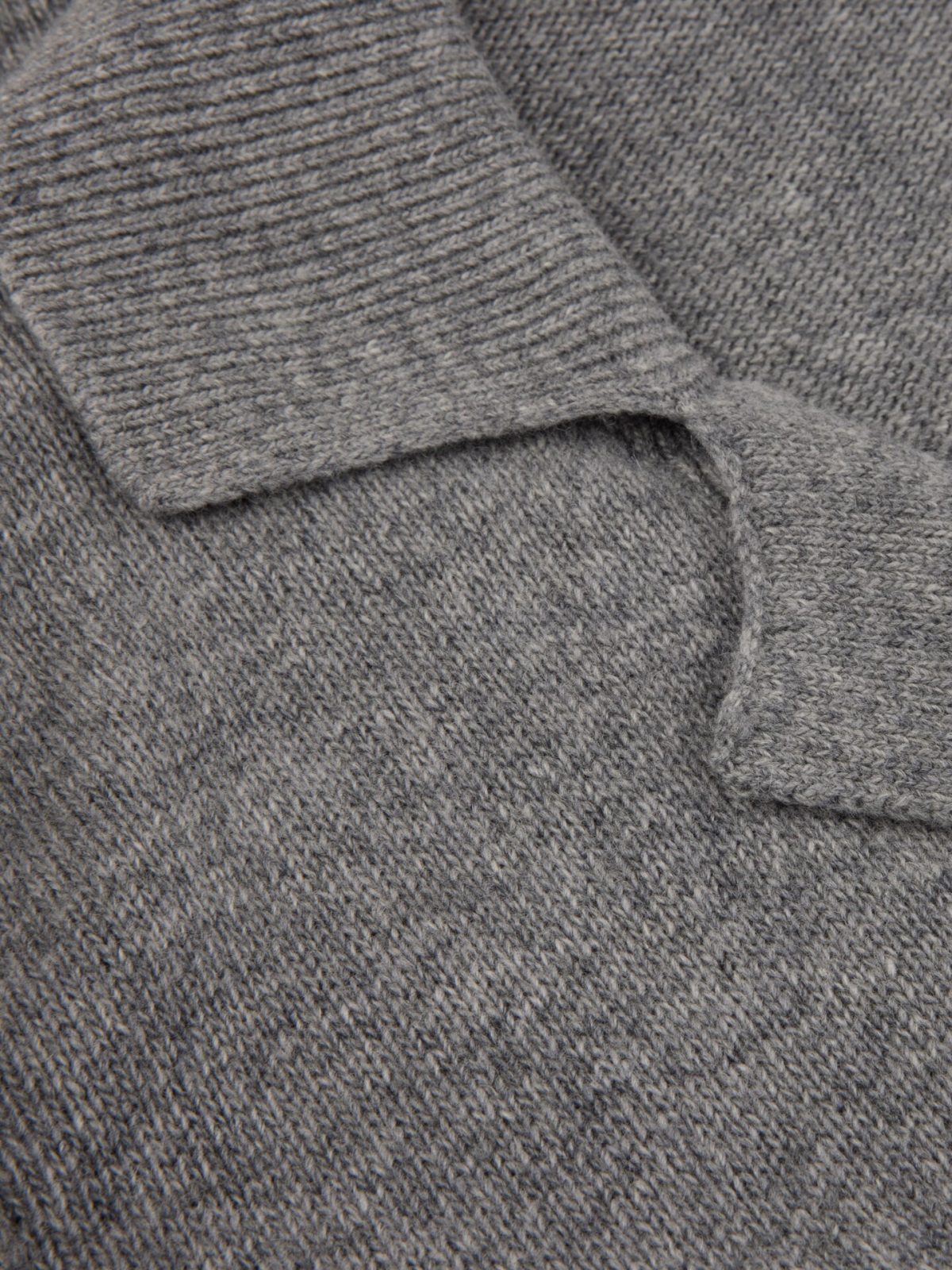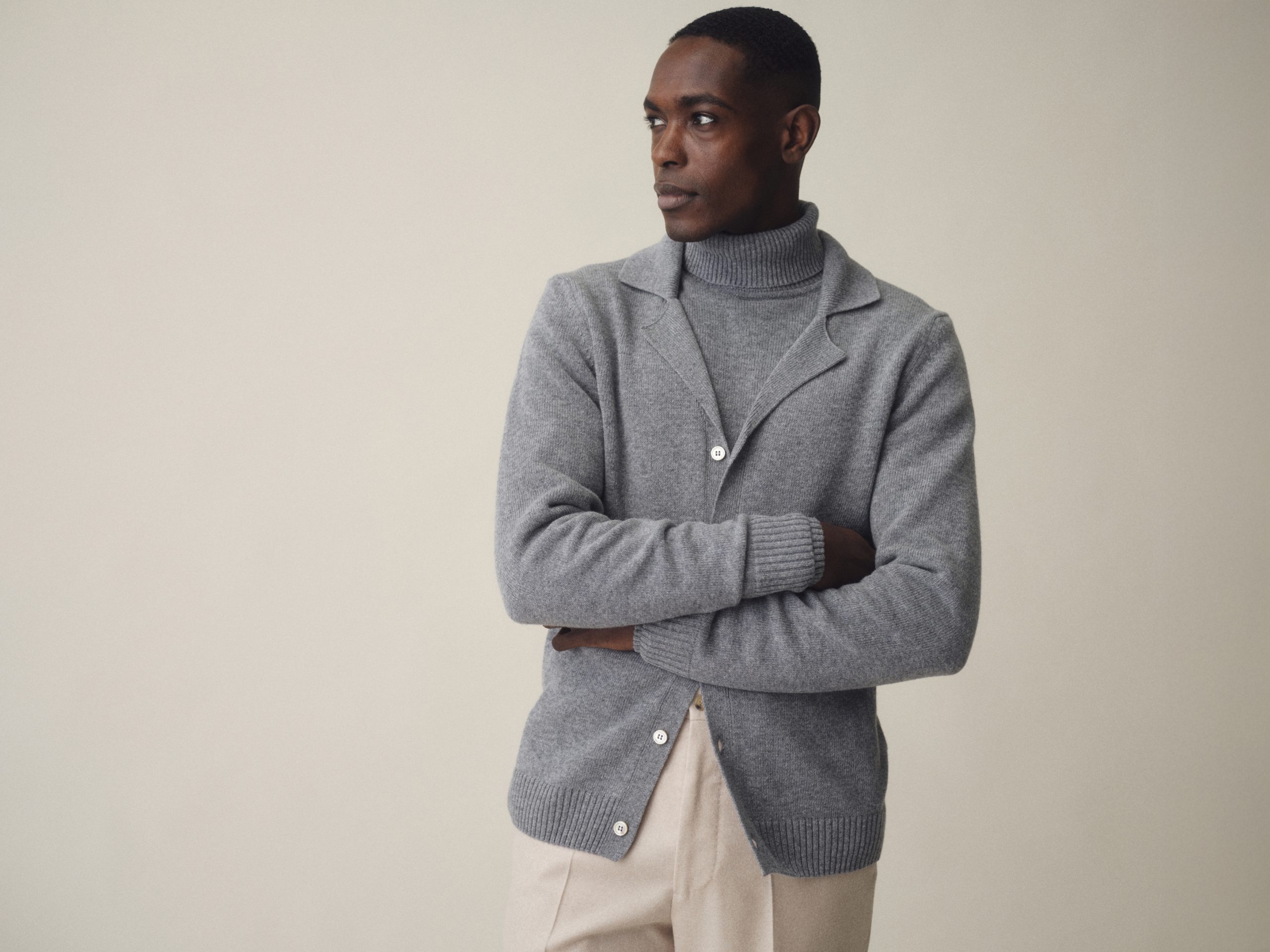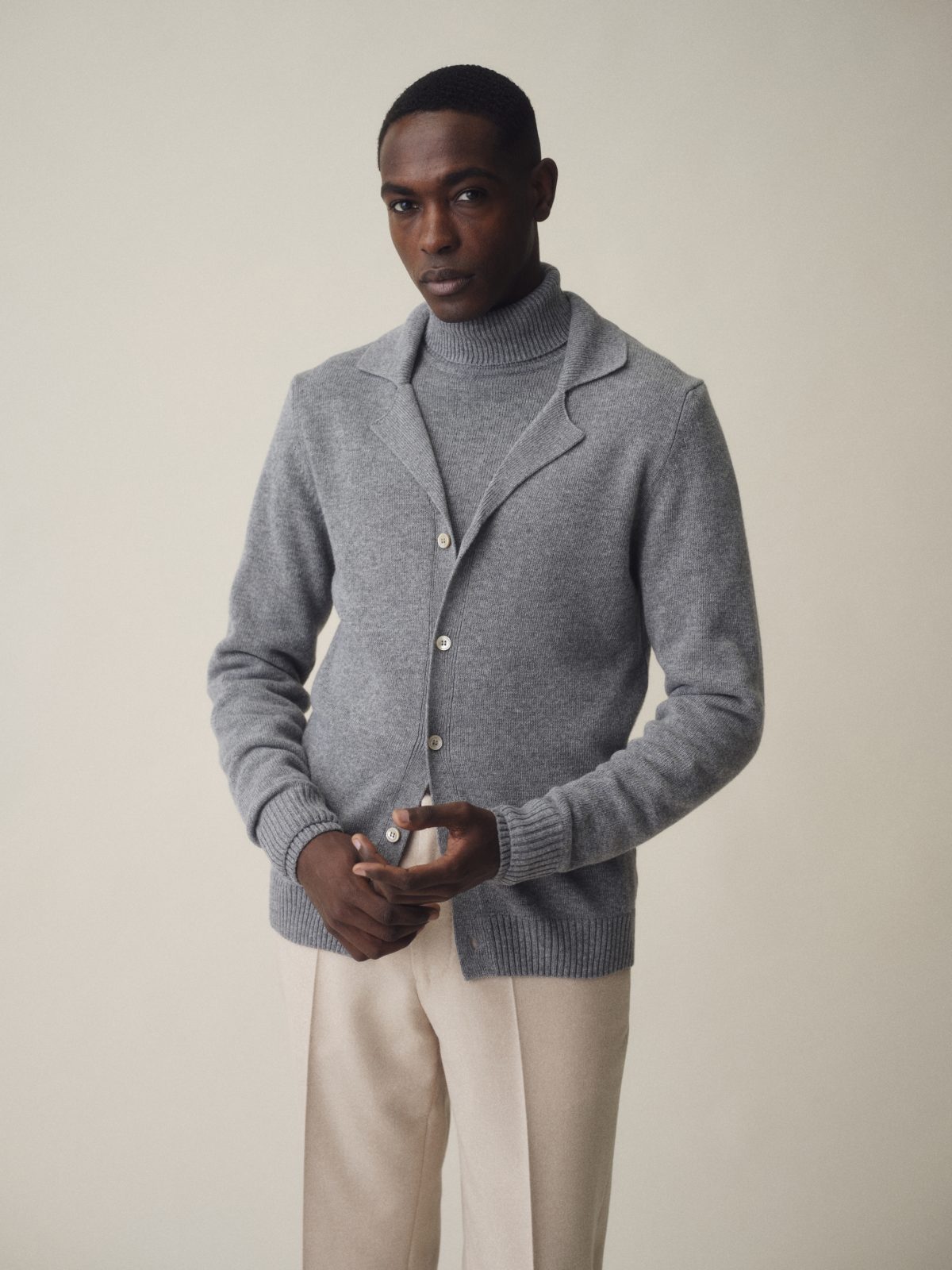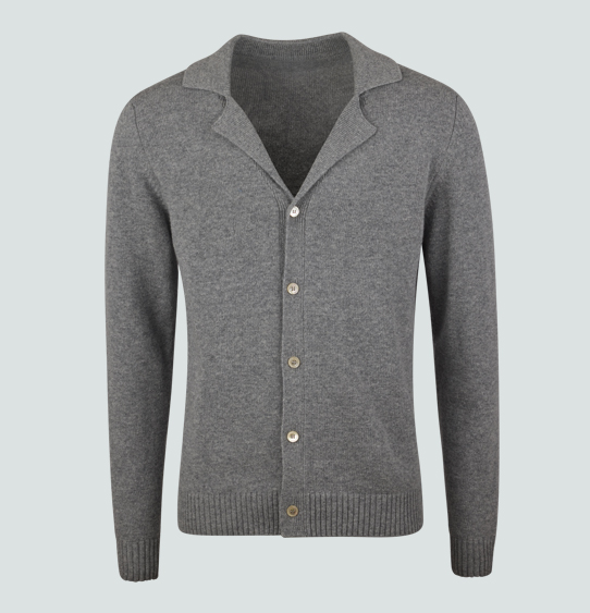 This cardigan is made of merino wool and is detailed with mother of pearl buttons, rib knitted collar, cuffs and hem.