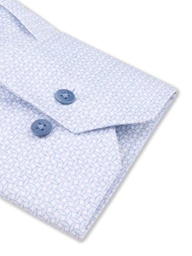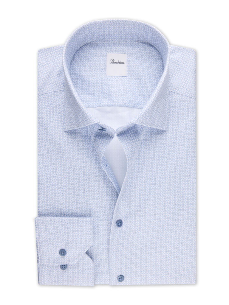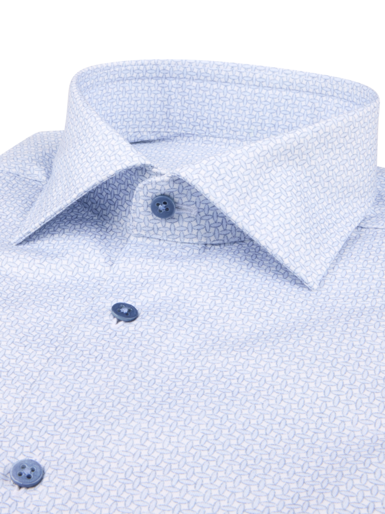 This twill shirt is made of twofold cotton and has a micro pattern. The shirt is detailed with mother of pearl buttons, single cuffs and a cut away collar.