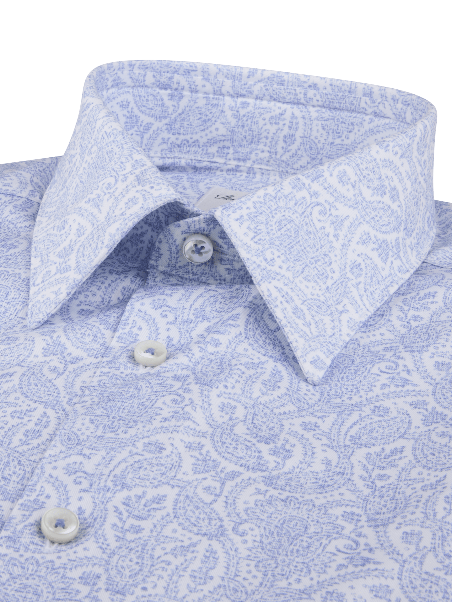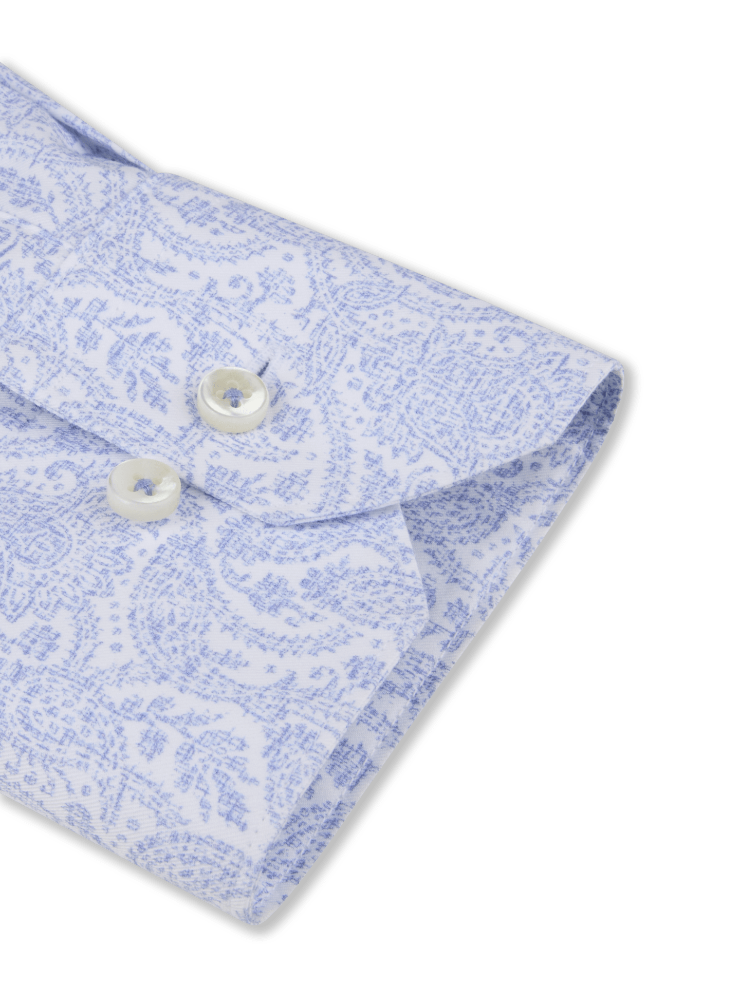 This patterned twill shirt is made of twofold cotton. The shirt is detailed with mother of pearl buttons, single cuffs and a Kent collar.