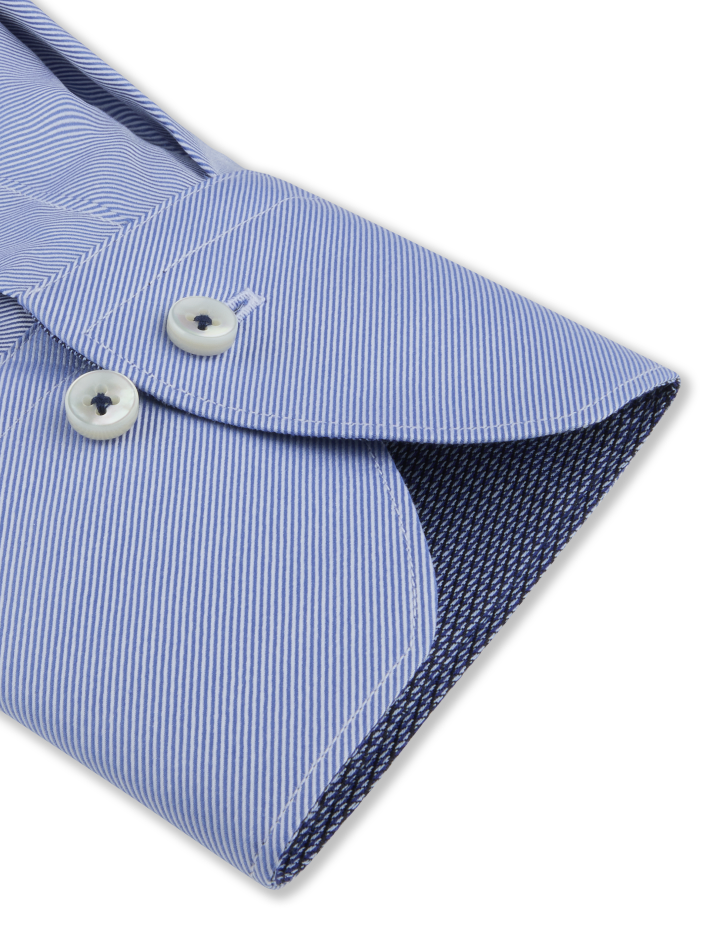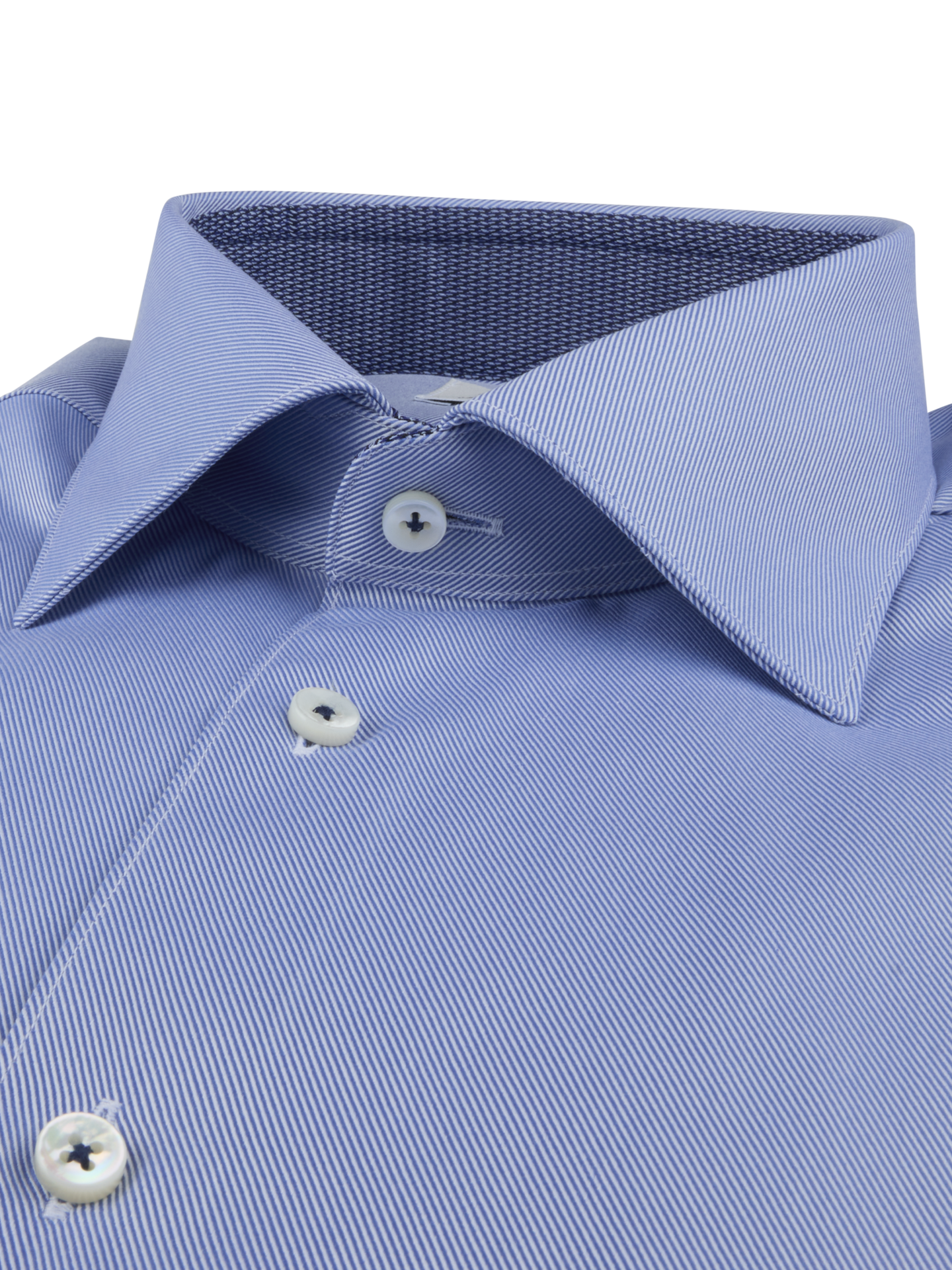 This twill shirt is made of twofold cotton. The shirt is designed with contrast inside collar and cuffs and is detailed with mother of pearl buttons, single cuffs and a cut away collar.