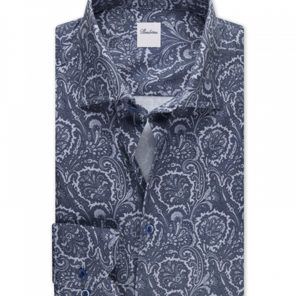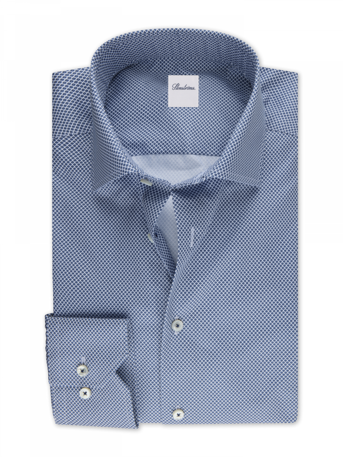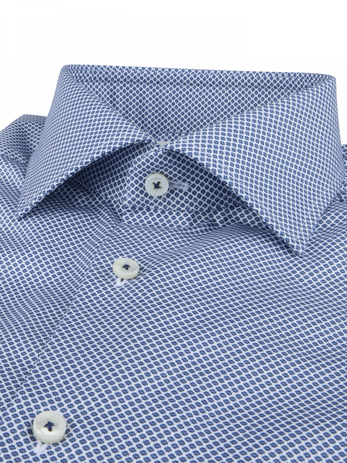 This twill shirt is made of twofold cotton and has a micro pattern. The shirt is detailed with mother of pearl buttons, single cuffs and a cut away collar.