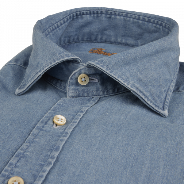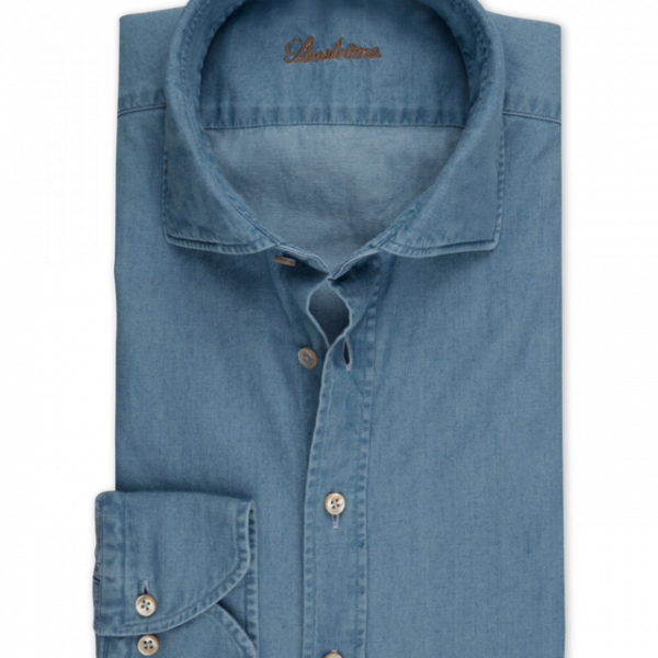 This twill shirt is made of twofold cotton. The shirt is designed with contrast inside collar and cuffs and is detailed with mother of pearl buttons, single cuffs and a cut away collar.