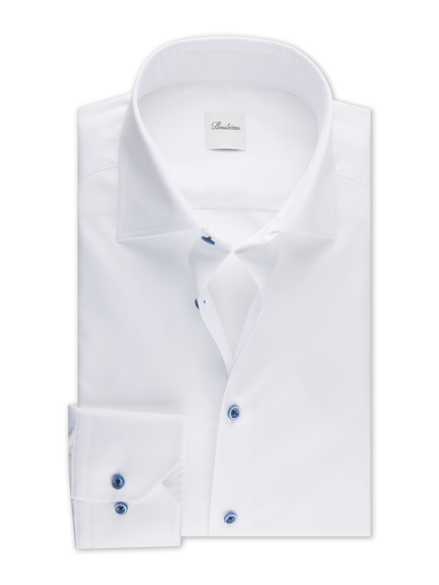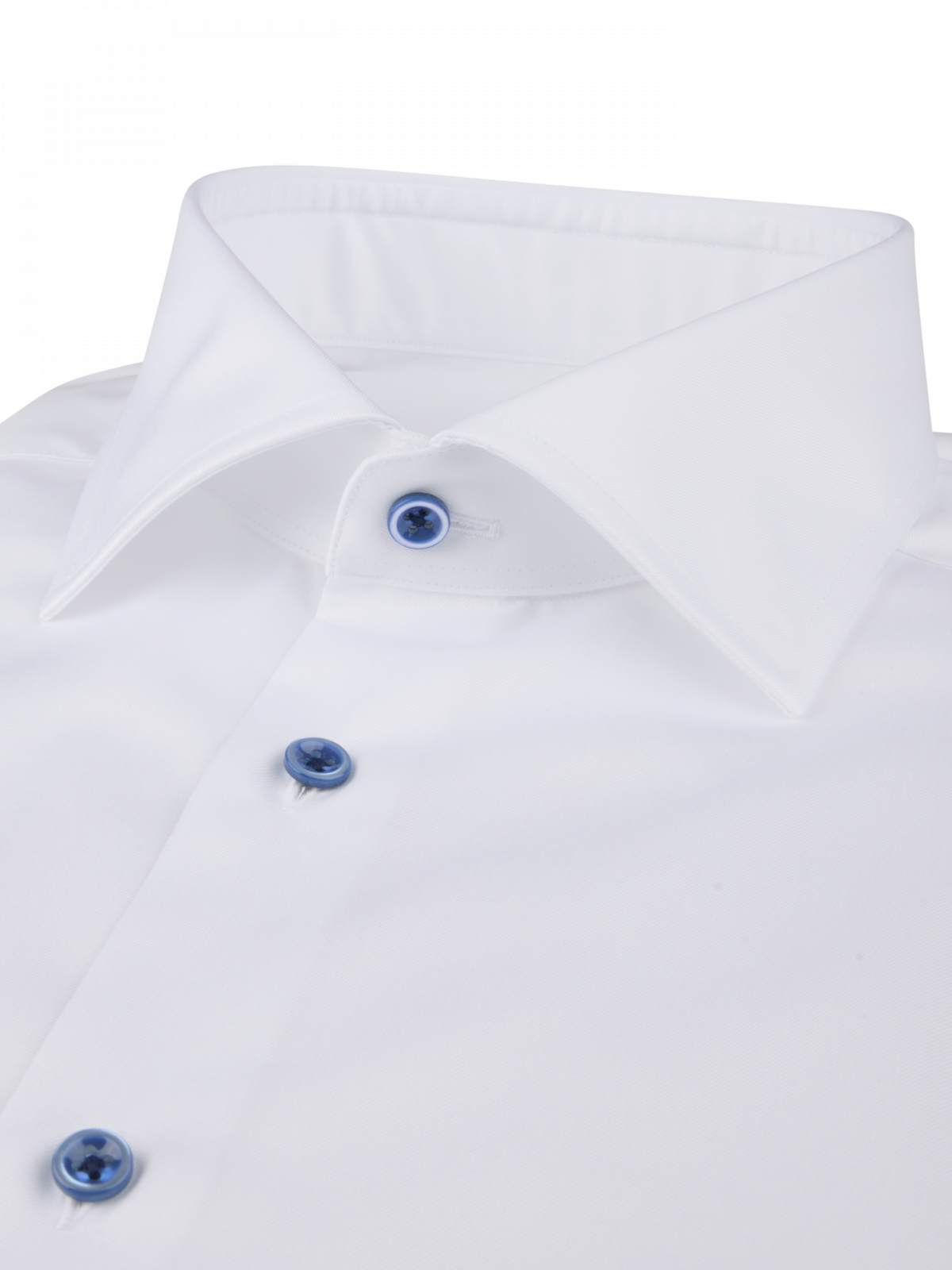 This twill shirt is made of twofold cotton. The shirt is detailed with mother of pearl buttons, single cuffs and a cut away collar.